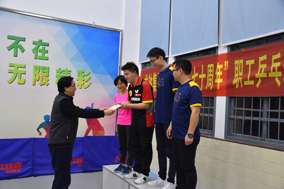 本次比賽吸引了眾多的乒乓精英。他們組成了六個參賽隊伍,每個隊伍由三男一女組成。比賽采用先循環后淘汰的賽制,每場團體賽包括混雙、男單、男單、女單、男雙五個項目,五局三勝。比賽現場你爭我奪、鏖戰正酣,一場場懸念重重、精彩紛呈的比賽引來陣陣熱烈的掌聲。最終,由張志鵬、沈一兵、陳文澤、楊益斌組成的球隊獲得了冠軍、林炳輝、溫文杰、黃志堅、郭藝紅組成的球隊獲得了亞軍、曾艷輝、范建洲、方藝明、陳志玉組成的球隊和黃慶偉、蔡躍漢、張文藝、唐秀娟組成的球隊并列獲得第三名。公司副總經理、工會主席康安偉到場觀看了比賽,為獲獎球隊頒獎并與參賽隊員合影留念。