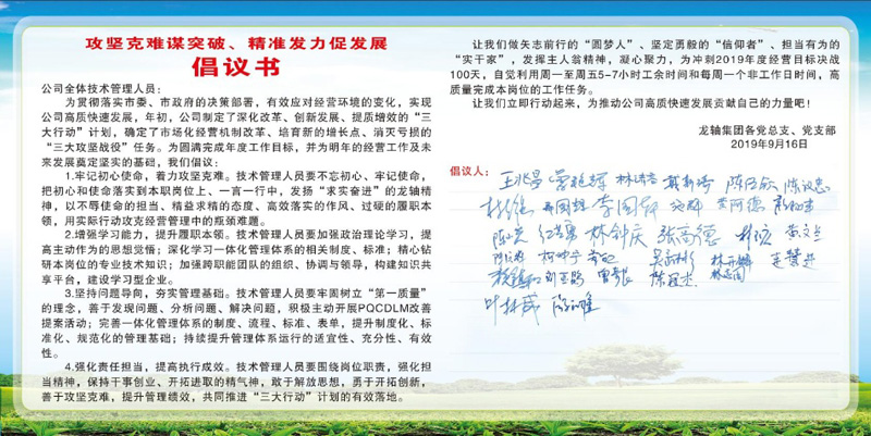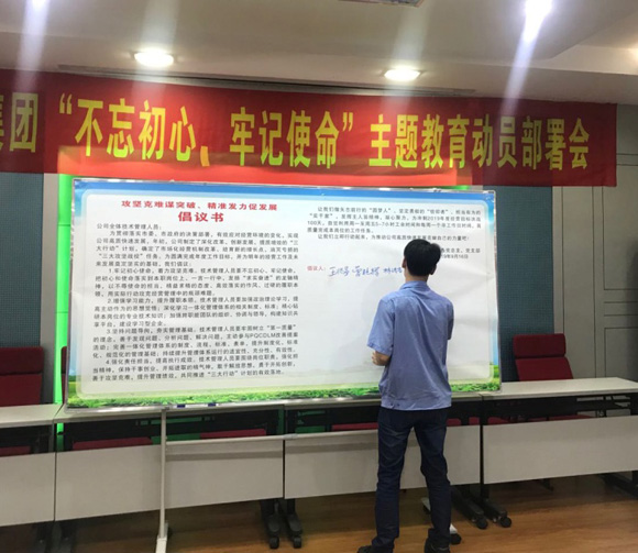 2019年9月16日,公司各黨總支、黨支部在二樓會議室開展 “攻堅克難謀突破、精準發(fā)力促發(fā)展”倡議書簽名活動。航空事業(yè)部黨支部書記王兆昌代表公司各黨總支、黨支部向全體技術管理人員發(fā)出倡議:一要牢記初心使命,著力攻堅克難;二要增強學習能力,提升履職本領;三要堅持問題導向,夯實管理基礎;四要強化責任擔當,提高執(zhí)行成效。號召全體技術管理人員做矢志前行的“圓夢人”、堅定勇毅的“信仰者”、擔當有為的“實干家”,發(fā)揮主人翁精神,凝心聚力,為沖刺2019年度經營目標決戰(zhàn)100天,自覺利用周一至周五5-7小時工余時間和每周一個非工作日時間,高質量完成本崗位的工作任務。最后,各黨總支(支部)書記依次在倡議書上簽字。