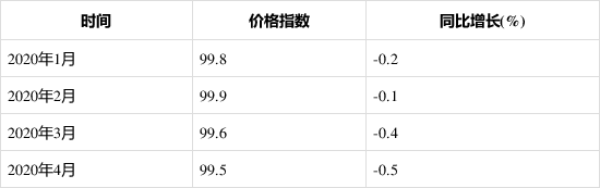 2020年1-4月軸承、齒輪和傳動部件制造工業(yè)生產(chǎn)者出廠價格指數(shù)同比漲跌圖(%)