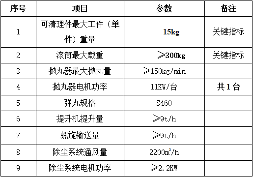 2.2功能、結(jié)構(gòu)須滿足如下要求:該設(shè)備主要由吊鉤輸送系統(tǒng)、清理室體、拋丸器、提升機(jī)、維修平臺(tái)、分離器、螺旋輸送器、底部料斗、除塵系統(tǒng)、電控系統(tǒng)等組成。