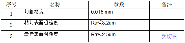 機床最大線切割速度≥120mm2/min,切割速度能達到越高越好。精加工(尺寸精度達到0.015mm,表面粗糙度達2.5um)時,線切割速度≥20mm2/min。