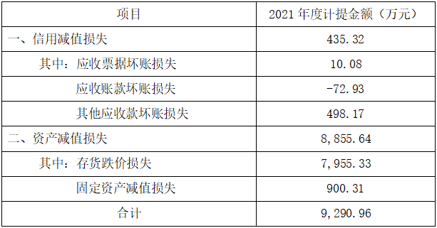 根據(jù)《企業(yè)會(huì)計(jì)準(zhǔn)則》及公司會(huì)計(jì)政策與會(huì)計(jì)估計(jì)的相關(guān)規(guī)定,為真實(shí)、準(zhǔn)確地反映公司截至 2021 年 12 月 31 日的財(cái)務(wù)狀況及經(jīng)營(yíng)成果,本著謹(jǐn)慎性原則,公司對(duì)截至 2021 年 12 月 31 日公司的資產(chǎn)進(jìn)行了減值測(cè)試,并與年審會(huì)計(jì)師進(jìn)行了充分的溝通,對(duì)可能發(fā)生資產(chǎn)減值損失的相關(guān)資產(chǎn)計(jì)提減值準(zhǔn)備。2021年確認(rèn)的資產(chǎn)減值損失及信用減值損失總額為9,290.96萬元,相應(yīng)減少當(dāng)年利潤(rùn)總額9,290.96萬元,具體情況如下表:
