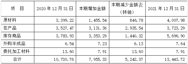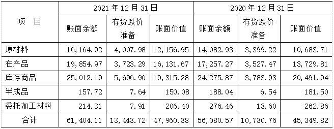 資產(chǎn)負(fù)債表日,公司對(duì)各項(xiàng)存貨的成本與可變現(xiàn)凈值比較,存貨成本高于其可變現(xiàn)凈值的,計(jì)提存貨跌價(jià)準(zhǔn)備,計(jì)入當(dāng)期損益。2021年公司存貨分類情況如下表(萬元):