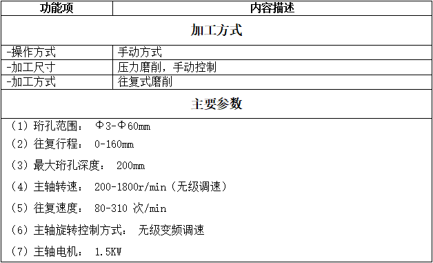 珩孔范圍: Ф3-Ф60mm ;往復行程: 0-160mm ;最大珩孔深度: 200mm