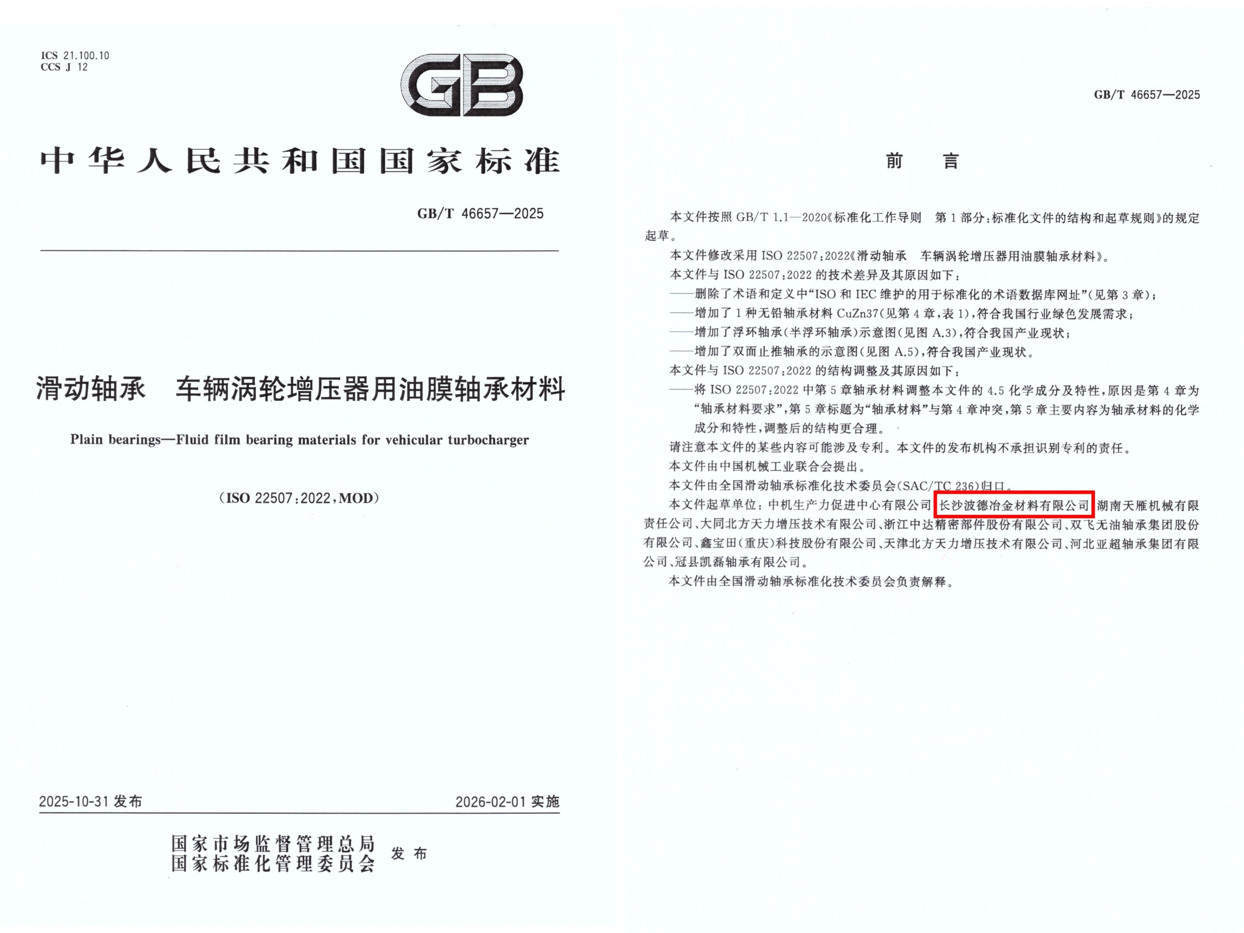 國家市場監督管理總局、國家標準化管理委員會正式批準發布的國家推薦性標準GB/T 46657-2025《滑動軸承 車輛渦輪增壓器用油膜軸承材料》將于近期正式實施,龍軸集團權屬企業長沙波德公司作為主要起草單位(排名第二),聯合國內車輛渦輪增壓器及油膜軸承材料相關生產企業共同起草該標準。