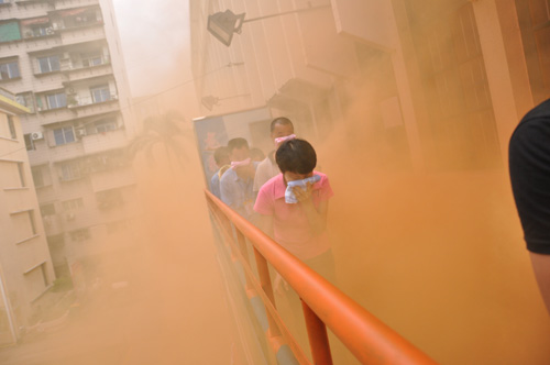 在闕教官講解相關(guān)消防知識(shí)和消防器材使用方法、傳授消防逃生應(yīng)變技能和自我保護(hù)技能及明確各演練職能小組職責(zé)和演練小組疏散路線之后,演練開始。滅火行動(dòng)組在得到演練命令后,立即發(fā)出火警訊號(hào),并在各指定點(diǎn)放啟煙霧彈,樓梯道和走廊瞬間頓時(shí)濃煙滾滾。各演練組聽到逃生訊號(hào)后,在應(yīng)急疏散隊(duì)的組織下,按組分批迅速有序地從俱樂部二樓往一樓籃球場(chǎng)疏散撤離,每人用濕毛巾捂住嘴巴,彎腰匍匐前進(jìn),按規(guī)定的順序疏散,直到?jīng)_出煙區(qū)。