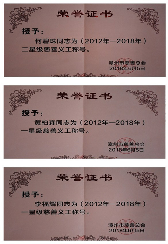 2018年6月5日,首屆漳州市星級(jí)慈善義工分隊(duì)、星級(jí)慈善義工授星儀式在漳州市慈善總會(huì)舉行,公司何碧珠同志榮獲二星級(jí)慈善義工稱號(hào),黃柏森同志和李福輝同志榮獲一星級(jí)慈善義工稱號(hào)。公司義工分隊(duì)自2012年成立以來(lái),圍繞“志愿、無(wú)償、友愛、互助”的服務(wù)精神,在扶貧濟(jì)困、安老扶幼、助學(xué)助醫(yī)、社區(qū)服務(wù)、慈善宣傳等方面積極開展志愿服務(wù)活動(dòng),為建設(shè)美麗、富裕、幸福漳州做出了龍軸貢獻(xiàn),充分體現(xiàn)了公司做為全國(guó)文明單位在履行社會(huì)責(zé)任、推進(jìn)幫扶工作的示范帶頭作用。
