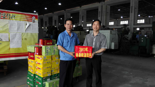????2017年8月21日下午,公司黨委書(shū)記董事長(zhǎng)曾凡沛、總經(jīng)理陳晉輝、副總經(jīng)理張逸青、工會(huì)主席康安偉一行前往金田公司鍛工車間、車工一車間、車工二車間、成品五車間、熱處理車間等生產(chǎn)現(xiàn)場(chǎng)慰問(wèn)堅(jiān)守崗位的職工,并送去涼茶、菊花茶、冬瓜茶等防暑降溫物品,讓他們?cè)谘籽紫娜罩懈惺艿疥囮嚽鍥觥?