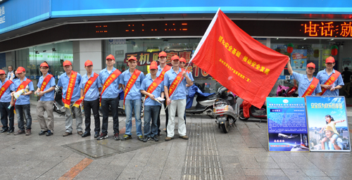 (圖a)志愿者深入到龍軸新村延安北路街頭,為過往行人分發安全生產宣傳資料
