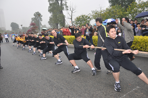 開幕儀式結束后,拔河比賽率先擂起了戰(zhàn)鼓,雖遇雨天,天寒路滑,運動員們依舊斗志昂揚,整齊的號子伴著現(xiàn)場觀眾激情的加油聲,現(xiàn)場一派熱火朝天。公司撥河隊健兒們卯足了勁兒比拼,惜敗于片仔癀代表隊。該項比賽最終由交通發(fā)展集團代表隊奪得冠軍。
