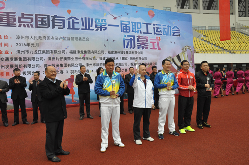隨著接力賽的結束,漳州市市屬重點國有企業(yè)第一屆職工運動會全部比賽項目圓滿完成,頒獎儀式及閉幕式隨后舉行。漳州市市委常委、漳州市政府常務副市長梁偉新、漳州市國資委主任黃建平、漳州市國資委書記魏小芬、漳州市國資委紀委書記柯坤海分別為各個項目獲獎運動隊代表頒發(fā)獎杯。