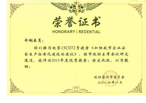 2016年1月18日上午,漳州市政協(xié)十二屆五次會議舉行開幕式,會上對2015年度優(yōu)秀提案進行表彰。漳州市政協(xié)委員、公司高級工程師許鋼提交的《加快我市企業(yè)安全標準化建設的建議》被評為“2015年度優(yōu)秀提案”。