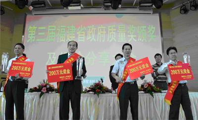 2012年10月19日上午,第三屆福建省政府質(zhì)量獎(jiǎng)?lì)C獎(jiǎng)大會(huì)在莆田召開,我司被福建省人民政府授予“2011年度福建省政府質(zhì)量獎(jiǎng)”,成為我市首家榮獲此獎(jiǎng)項(xiàng)的企業(yè)。福建省質(zhì)量技術(shù)監(jiān)督局局長(zhǎng)黃維禮、莆田市人民政府市長(zhǎng)梁建勇等領(lǐng)導(dǎo)出席大會(huì)并為獲獎(jiǎng)單位頒獎(jiǎng),圖為公司黨委書記、董事長(zhǎng)曾凡沛接受獎(jiǎng)杯和獎(jiǎng)金。