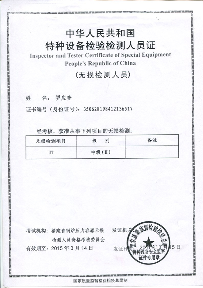 無損檢測證書